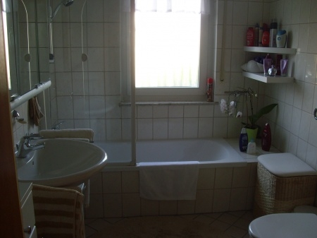 Immobilienausstattung Das modern geflieste Bad ist mit einer Wanne und Badewannen-Duschaufatz, WC und Fenster ausgestattet.